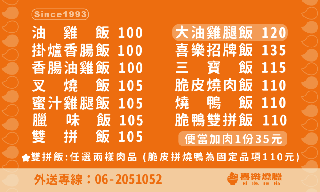 今天就吃喜樂燒臘的燒鴨飯、油雞飯、三寶飯、叉燒飯還有經典的脆皮燒肉飯,趕快拿起電話訂起來。